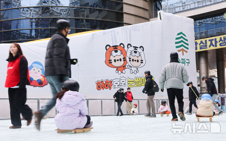 [서울=뉴시스] 권창회 기자 = 28일 서울 송파구 가든파이브에서 열린 하하호호 눈썰매장에서 어린이와 학부모들이 신나게 눈썰매를 즐기고 있다. 2025.12.23. [email protected]