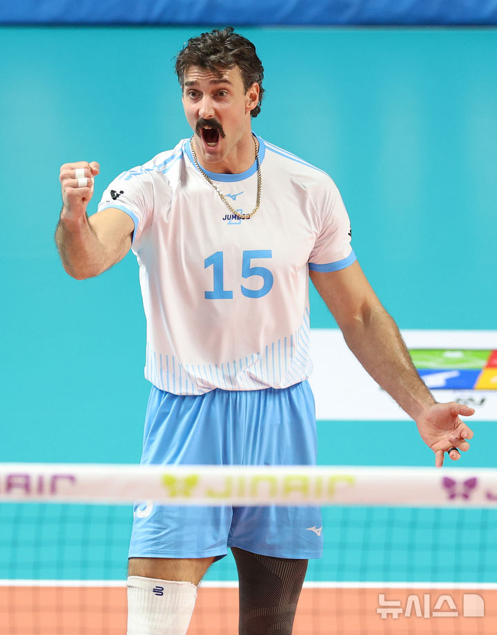[서울=뉴시스] 조성우 기자 = 28일 오후 서울 중구 장충체육관에서 열린 2025~2026 V리그 남자부 우리카드와 대한항공의 경기, 대한항공 러셀이 득점 후 환호하고 있다. 2025.12.28. [email protected]