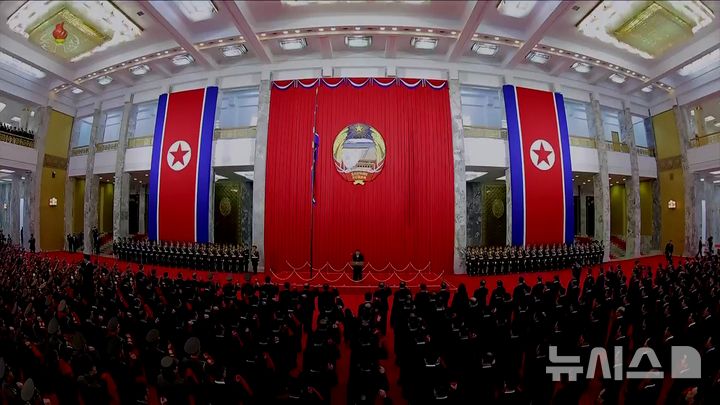 [서울=뉴시스] 김정은 북한 국무위원장이 지난 27일 만수대의사당에서 조선민주주의인민공화국 헌법절 기념 행사에 참석했다고 조선중앙TV가 28일 보도했다. (사진=조선중앙TV 캡처) 2025.12.28. [email protected]