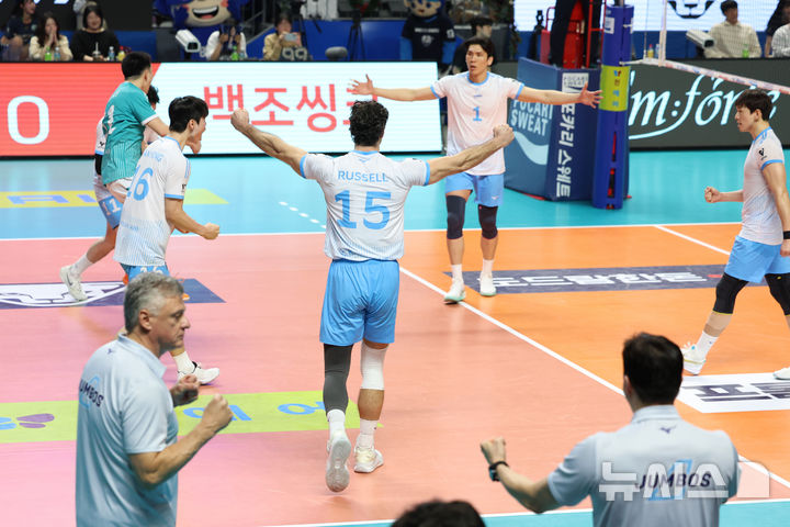 [서울=뉴시스] 조성우 기자 = 28일 오후 서울 중구 장충체육관에서 열린 2025~2026 V리그 남자부 우리카드와 대한항공의 경기, 대한항공 러셀 등 선수들이 세트스코어 3-1로 우리카드에 승리한 뒤 기뻐하고 있다. 2025.12.28. [email protected]