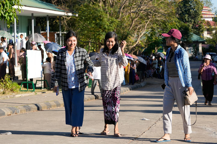 [네피도=AP/뉴시스] 28일(현지 시간) 미얀마 네피도의 한 투표소에서 총선 1차 투표를 마친 유권자들이 웃으며 나오고 있다. 미얀마에서 군부 쿠데타 이후 4년 10개월 만에 첫 선거가 열렸으나, 군부에 반대하는 정당은 선거에서 배제되면서 이번 총선이 군부 통치 연장이 될 것이라는 분석이 나오고 있다. 2025.12.29.