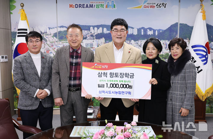 [삼척=뉴시스] 홍춘봉 기자 = 29일 강원 삼척시농업기술센터 삼척시도시농업연구회(회장 이희석)가 국화전시회 등으로 발생한 수익금 100만원을 향토장학금으로 써달라며 29일 박상수(가운데) 삼척시장에게 기탁하고 있다.(사진=삼척시 제공)[email protected]