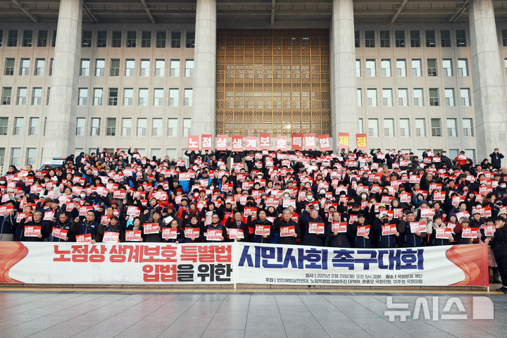 [서울=뉴시스] 고승민 기자 = 빈민해방실천연대, 노점특별법 입법추진 대책위 등 시민단체 회원들이 29일 서울 여의도 국회 본청 앞에서 노점상 생계보호 특별법 입법을 위한 시민사회 촉구대회를 하고 있다. 2025.12.29. [email protected]