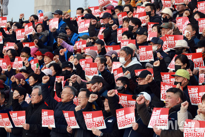 [서울=뉴시스] 고승민 기자 = 빈민해방실천연대, 노점특별법 입법추진 대책위 등 시민단체 회원들이 29일 서울 여의도 국회 본청 앞에서 노점상 생계보호 특별법 입법을 위한 시민사회 촉구대회를 하고 있다. 2025.12.29. [email protected]