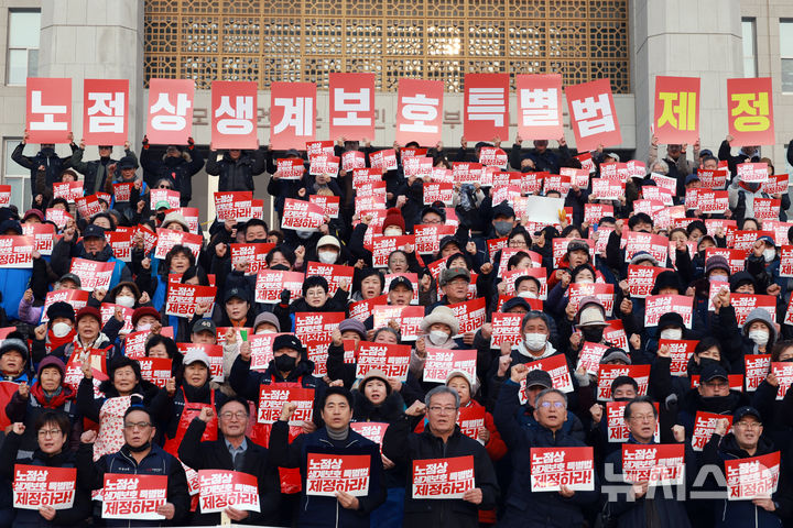 [서울=뉴시스] 고승민 기자 = 빈민해방실천연대, 노점특별법 입법추진 대책위 등 시민단체 회원들이 29일 서울 여의도 국회 본청 앞에서 노점상 생계보호 특별법 입법을 위한 시민사회 촉구대회를 하고 있다. 2025.12.29. [email protected]