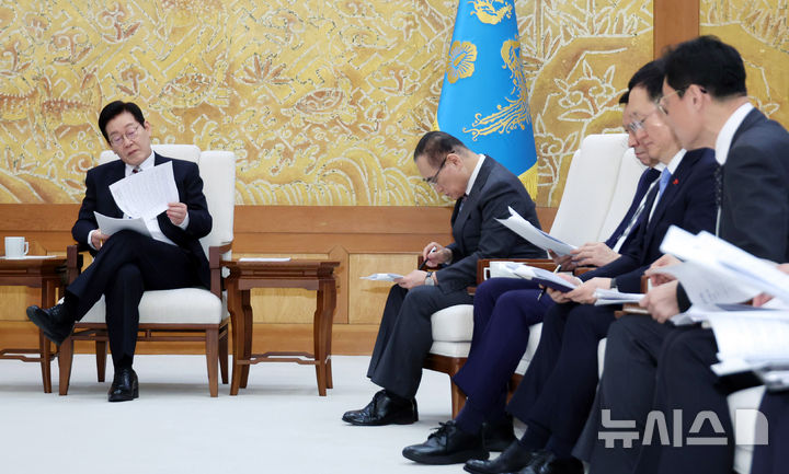 [서울=뉴시스] 최동준 기자 = 이재명 대통령이 29일 청와대 본관에서 위성락 안보실장, 우상호 정무수석 등 참모진과 차담회를 하고 있다. (청와대통신사진기자단) 2025.12.29. [email protected]