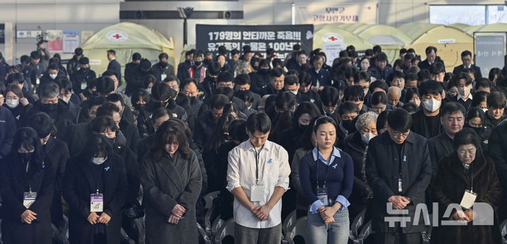 [무안=뉴시스] 사진공동취재단 = 12·29 제주항공 여객기 참사 1주기인 29일 오전 전남 무안국제공항에 마련된 추모식장에서 사고 발생 시간인 오전 9시 3분에 맞춰 추모 사이렌이 울리자, 유가족과 참석자들이 고개를 숙인 채 희생자들을 기리며 묵념하고 있다. 2025.12.29. [email protected]
