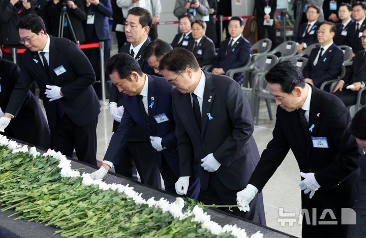 [무안=뉴시스] 이영주 기자 = 12·29 제주항공 여객기 참사 1주기인 29일 오전 전남 무안군 무안국제공항에서 열린 추모식 도중 국회 대표단이 제단에 헌화하고 있다. 오른쪽부터 장동혁 국민의힘 대표, 우원식 국회의장, 정청래 더불어민주당 대표, 이양수 국정조사 특별위원회 위원장, 김병기 더불어민주당 원내대표, 천하람 개혁신당 원내대표. 2025.12.29. [email protected]