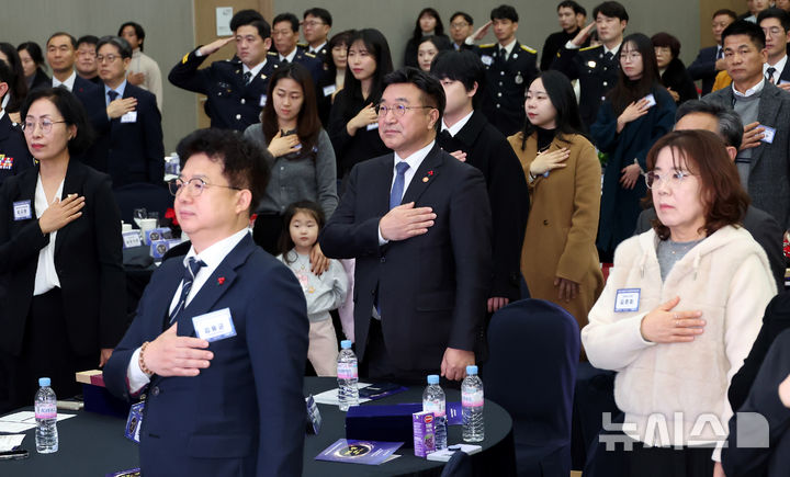 [세종=뉴시스] 강종민 기자 = 윤호중 행정안전부 장관이 29일 세종시 정부세종컨벤션센터에서 열린 2025 대한민국 안전동행 한마음 행사에서 국민의례를 하고 있다. 2025.12.29. [email protected]