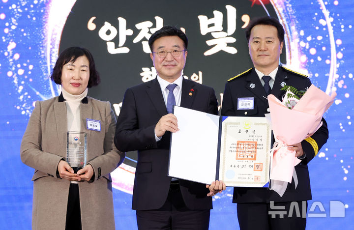 [세종=뉴시스] 강종민 기자 = 근정포장을 수상한 강경학 전남 무안소방서 소방위가 29일 세종시 정부세종컨벤션센터에서 열린 2025 대한민국 안전동행 한마음 행사에서 윤호중 행정안전부 장관과 기념촬영을 하고 있다. 2025.12.29. [email protected]