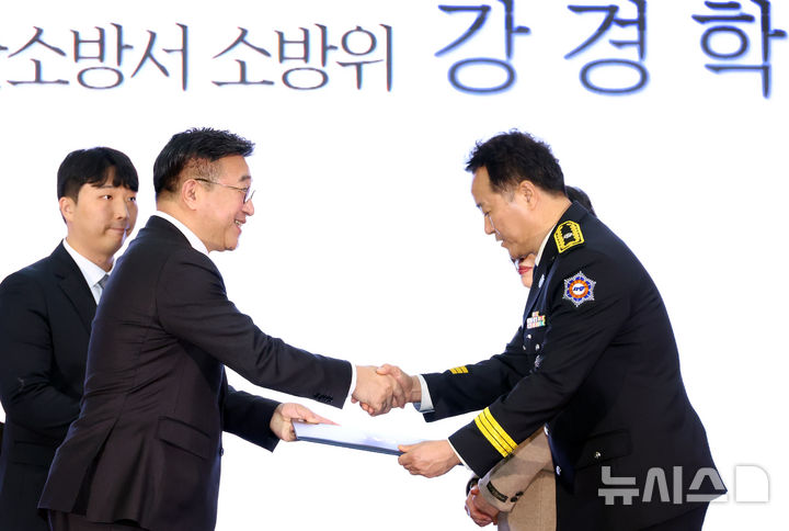 [세종=뉴시스] 강종민 기자 = 윤호중 행정안전부 장관이 29일 세종시 정부세종컨벤션센터에서 열린 2025 대한민국 안전동행 한마음 행사에서 강경학 전남 무안소방서 소방위에게 근정포장을 전달하고 있다. 2025.12.29. [email protected]