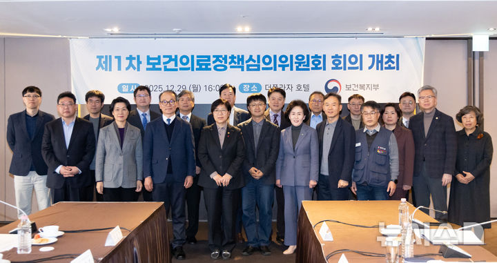 [서울=뉴시스] 황준선 기자 = 정은경(앞줄 왼쪽 네 번째) 보건복지부 장관을 비롯한 참석자들이 29일 오후 서울 중구 더플라자호텔에서 열린 2025년 제1차 보건의료정책심의위원회에서 기념촬영 하고 있다. 2025.12.29. [email protected]