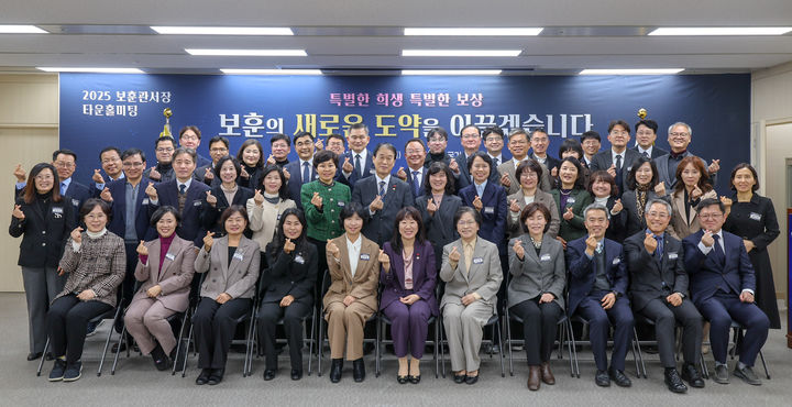 [서울=뉴시스] 이영환 기자 = 권오을 국가보훈부 장관이 29일 오후 세종시 정부세종청사 국가보훈부에서 열린 2025년 하반기 전국 보훈관서장 회의에서 참석자들과 기념촬영을 하고 있다. (사진=국가보훈부 제공) 2025.12.29. [email protected] *재판매 및 DB 금지
