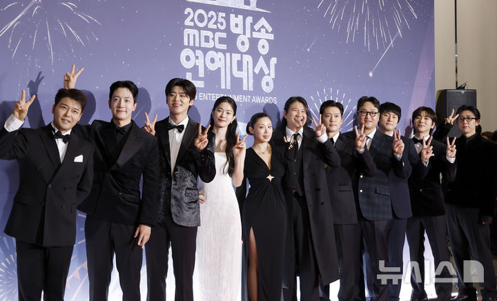 [서울=뉴시스] 김혜진 기자 = 방송인 전현무(왼쪽부터), 고강용, 박지현, 옥자연, 리정, 임우일, 김대호, 구성환, 기안84, 이주승, 코드쿤스트가 29일 오후 서울 마포구 MBC 사옥에서 열린 2025 MBC 방송연예대상에서 포즈를 취하고 있다. 2025.12.29. [email protected]