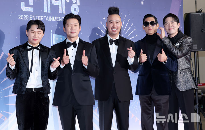 [서울=뉴시스] 김혜진 기자 = 방송인 양세형(왼쪽부터), 김대호, 유희관, 박준형, 붐이 29일 오후 서울 마포구 MBC 사옥에서 열린 2025 MBC 방송연예대상에서 포즈를 취하고 있다. 2025.12.29. [email protected]