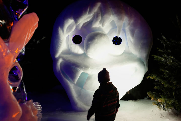 [오버하우젠=AP/뉴시스] 29일(현지 시간) 독일 오버하우젠에서 열린 얼음·눈 조각 전시회에서 한 어린이가 카니발을 묘사한 얼음 작품을 바라보고 있다. 이 전시회에는 24개국 예술가들이 영하 8도의 날씨 속에서 400톤의 얼음으로 제작한 작품들이 전시됐다. 2025.12.30.