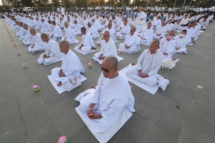 [프놈펜=AP/뉴시스] 29일(현지 시간) 캄보디아 프놈펜에서 불교 승려들이 평화를 기원하는 기도 의식을 행하고 있다. 캄보디아 전역에서 제27주년 '평화의 날'을 맞아 민족의 연대와 단결 정신을 강화하고 왕실과 군에 대한 국민적 지지와 신뢰를 높이는 기도회가 열렸다. 2025.12.30.