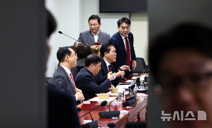 [서울=뉴시스] 김명년 기자 = 30일 오전 서울 여의도 국회 의원회관에서 국민의힘 송석준 등 의원들이 초·재선 의원 모임 '대안과 책임'에 참석해 있다. 2025.12.30. [email protected]