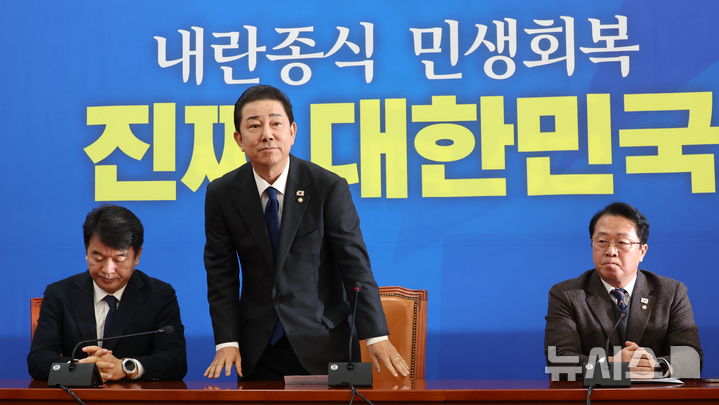 [서울=뉴시스] 김금보 기자 = 김병기 더불어민주당 원내대표가 30일 오전 서울 여의도 국회에서 열린 원내대책회의에서 원내대표 사퇴 의사를 밝히고 사과 인사를 하기위해 일어나고 있다. 2025.12.30. [email protected]