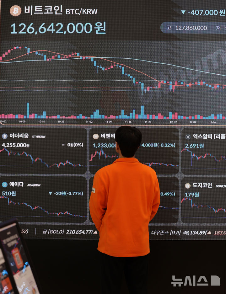 [서울=뉴시스] 이영환 기자 = 비트코인이 1억2700만원선 안팎에서 횡보하며 제자리걸음을 이어가고 있는 30일 서울 강남구 빗썸라운지 강남점 전광판에 비트코인 시세가 표시되고 있다. 2025.12.30. [email protected]