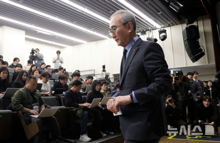 [서울=뉴시스] 홍효식 기자 = 김영섭 KT 대표이사가 30일 오후 서울 종로구 KT 광화문빌딩 웨스트 사옥에서 소액결제 피해 및 침해사고와 관련해 사과한 뒤 단상을 내려오고 있다. 2025.12.30. [email protected]