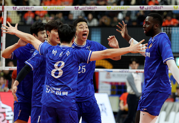 [서울=뉴시스] 김진아 기자 = 30일 부산강서체육관에서 열린 진에어 2025-26 V-리그 프로배구대회 한국전력과 OK 와의 경기, 한국전력 신영석이 환호하고 있다. (사진=한국전력 배구단 제공) 2025.12.30. [email protected] *재판매 및 DB 금지