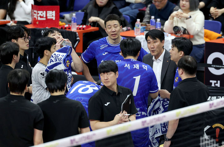 [서울=뉴시스] 김진아 기자 = 30일 부산강서체육관에서 열린 진에어 2025-26 V-리그 프로배구대회 한국전력과 OK 와의 경기, 한국전력 권영민 감독이 작전을 지시하고 있다. (사진=한국전력 배구단 제공) 2025.12.30. [email protected] *재판매 및 DB 금지