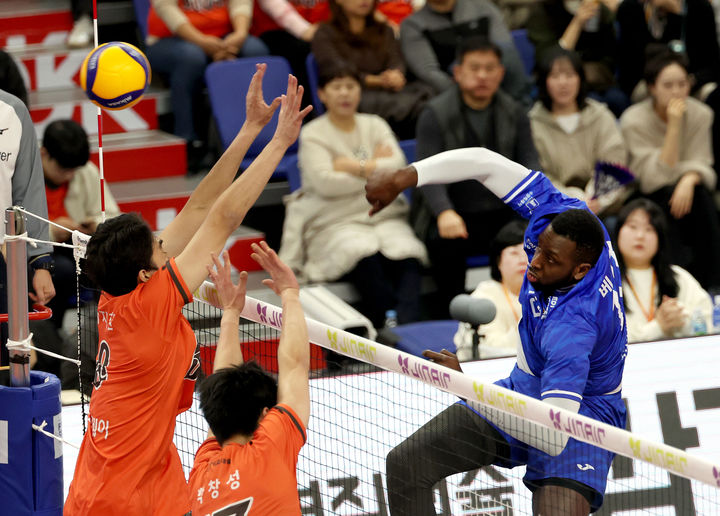 [서울=뉴시스] 김진아 기자 = 30일 부산강서체육관에서 열린 진에어 2025-26 V-리그 프로배구대회 한국전력과 OK 와의 경기, 한국전력 베논이 공격하고 있다. (사진=한국전력 배구단 제공) 2025.12.30. [email protected] *재판매 및 DB 금지