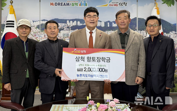 [삼척=뉴시스]홍춘봉 기자 =강원 삼척시 농촌지도자삼척시연합회는 31일 영농부산물 파쇄지원단 운영해 창출한 수익금 200만원을 향토장학금으로 써달라며 박상수(가운데) 삼척시장에게 기탁하고 있다.(사진=삼척시 제공)[email protected]
