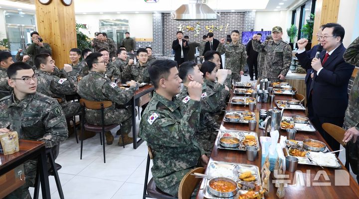 [대전=뉴시스] 이장우 대전시장이 31일 육군 제32보병사단을 방문해 2025년 비상대비훈련과 밀입국 검거를 성공적으로 마친 장병들의 노고를 격려하고 위문금을 전달했다. 이 시장이 부대식당에서 장병들에게 인사말을 하고 있다. (사진=대전시 제공) 2025. 12. 31 [email protected]