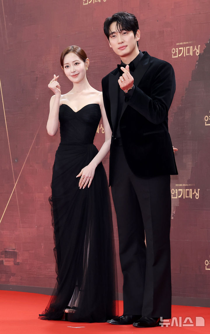 [서울=뉴시스] 김혜진 기자 = 배우 신슬기(왼쪽), 윤박이 31일 오후 서울 영등포구 KBS에서 열린 2025 KBS 연기대상에서 포즈를 취하고 있다. 2025.12.31. [email protected]