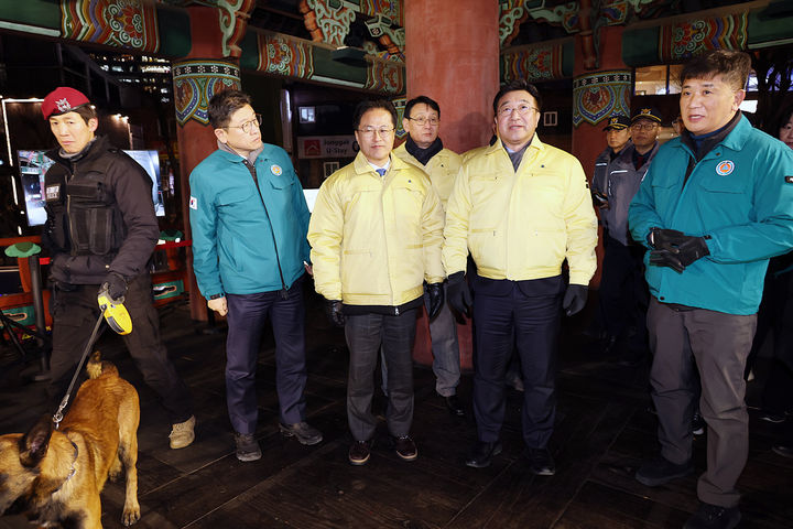 [서울=뉴시스] 조성우 기자 = 윤호중 행정안전부 장관이 31일 오후 서울 종로구 보신각 제야의 종 타종 행사를 앞두고 일대 인파 관리 대책 등 안전 현장점검을 하고 있다. (사진=행정안전부 제공) 2025.12.31. [email protected] *재판매 및 DB 금지