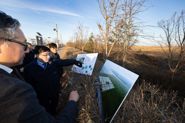 [서울=뉴시스] 조성우 기자 = 김성환 기후에너지환경부 장관이 31일 충남 당진시 대한제강 스마트팜 클러스터 구축 예정지를 찾아 철강 제조 과정에서 발생하는 폐열을 활용한 스마트팜 부지 조성 추진 상황을 점검하고 있다. (사진=기후에너지환경부 제공) 2025.12.31. [email protected] *재판매 및 DB 금지