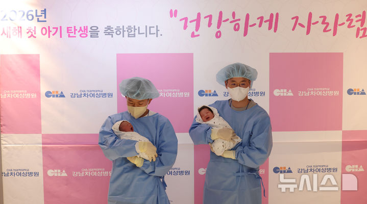 [서울=뉴시스] 조성우 기자 = 2026년 병오년 새해 첫 아기가 1일 0시께 서울 강남구 강남차여성병원에서 태어났다. 엄마 황은정(37), 아빠 윤성민(38) 씨 사이에서 태어난 여아 쨈이(태명)와 엄마 황혜련(37), 아빠 정동규(36) 사이에서 태어난 여아 도리(태명)가 아빠 품에 안겨있다. 2026.01.01. [email protected]