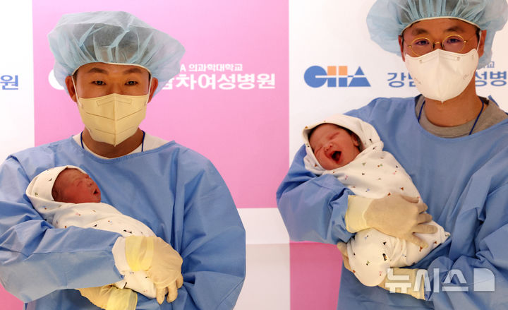 [서울=뉴시스] 조성우 기자 = 2026년 병오년 새해 첫 아기가 1일 0시께 서울 강남구 강남차여성병원에서 태어났다. 엄마 황은정(37), 아빠 윤성민(38) 씨 사이에서 태어난 여아 쨈이(태명, 왼쪽)와 엄마 황혜련(37), 아빠 정동규(36) 사이에서 태어난 여아 도리(태명)가 아빠 품에 안겨있다. 2026.01.01. [email protected]