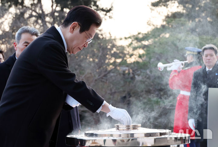 [서울=뉴시스] 고범준 기자 = 이재명 대통령이 새해 첫 날 1일 서울 동작구 국립서울현충원 현충탑에 참배하며 분향하고 있다. (청와대통신사진기자단) 2026.01.01. [email protected]