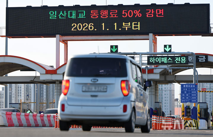 [김포=뉴시스] 황준선 기자 = 일산대교의 통행료가 50% 인하된 1일 오전 경기 김포시 일산대교 톨게이트 전광판에 요금 인하 안내문이 게시돼 있다. 2026.01.01. [email protected]