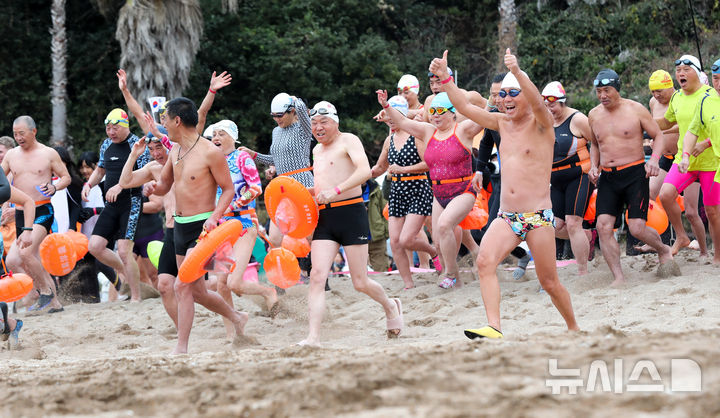 [서귀포=뉴시스] 우장호 기자 = 병오년(丙午年) 새해 첫날인 1일 오전 제주 서귀포시 중문색달해수욕장에서 열린 '제27회 서귀포 겨울바다 국제펭귄수영대회'에서 도민과 내외국인 관광객들이 차가운 바닷물에 뛰어 들며 희망찬 2026년을 맞이하고 있다. 2026.01.01. [email protected]
