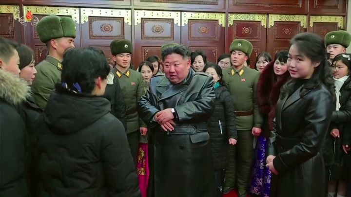 [서울=뉴시스] 김정은 북한 국무위원장이 1일 평양 5월1일경기장에서 열린 2026년 신년경축공연에 참가한 러시아 파병 '해외작전부대' 지휘관 가족들을 만났다고 조선중앙TV가 1일 보도했다. (사진=조선중앙TV 캡처) 2026.01.01. [email protected] *재판매 및 DB 금지