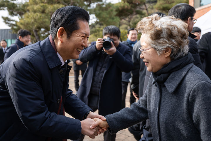 [서울=뉴시스] 고승민 기자 = 정청래 더불어민주당 대표가 1일 경남 김해 봉하마을 노무현 전 대통령 관저에서 권양숙 여사를 예방하고 있다. (사진=더불어민주당 제공) 2026.01.01. [email protected] *재판매 및 DB 금지