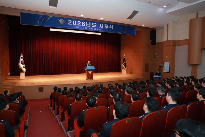 [인천=뉴시스] 이루비 기자 = 2일 오후 인천 연수구 해양경찰청 대강당에서 열린 2026년 시무식에서 장인식 해양경찰청장 직무대행이 신년 인사말을 하고 있다. 이날 해경청은 새해를 맞아 안정적인 해양법 질서 확립, 국민에게 신뢰받는 해양안전망 구축, 지속 가능한 미래를 만들어 나갈 것을 다짐하며 자체 시무식을 개최했다. (사진=해양경찰청 제공) 2026.01.02. [email protected]