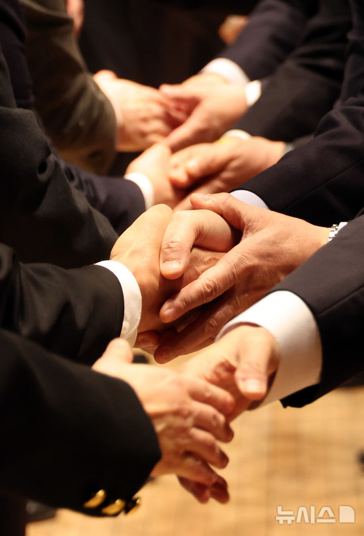 [세종=뉴시스] 강종민 기자 = 2일 세종시 정부세종청사 대강당에서 열린 2026 정부 시무식에서 김민석 국무총리와 장관, 참석자들이 악수하고 있다. 2026.01.02. [email protected]
