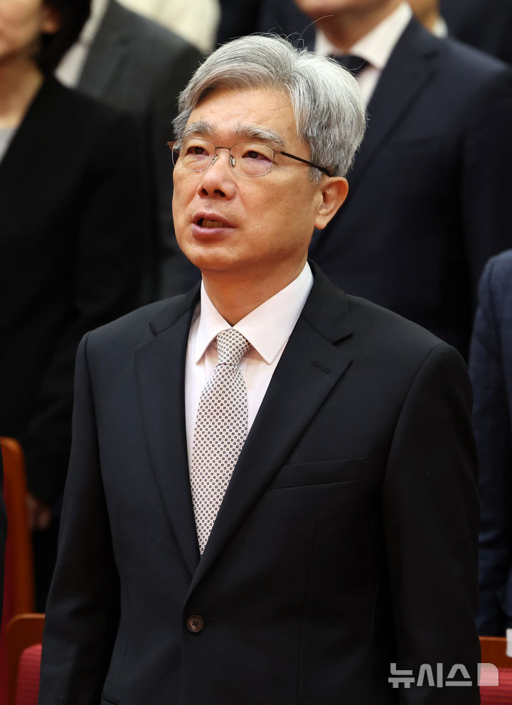 [서울=뉴시스] 이영환 기자 = 김상환 헌법재판소장이 2일 오전 서울 종로구 헌법재판소에서 열린 시무식에 참석해 애국가를 부르고 있다. 2026.01.02. [email protected]
