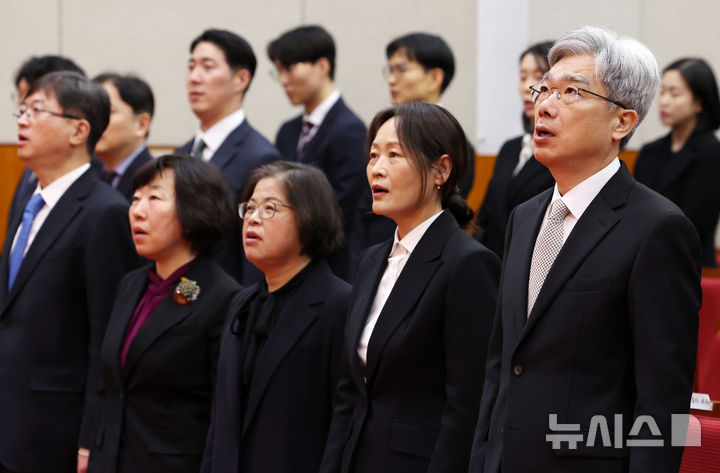 [서울=뉴시스] 이영환 기자 = 김상환 헌법재판소장과 재판관들이 2일 오전 서울 종로구 헌법재판소에서 열린 시무식에 참석해 애국가를 부르고 있다. 오른쪽부터 김 헌법재판소장, 정정미, 김복형, 정계선, 오영준 재판관. 2026.01.02. [email protected]
