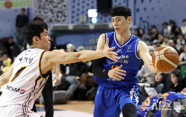 [서울=뉴시스] 조성우 기자 = 2일 오후 서울 송파구 잠실실내체육관에서 열린 2025~2026 LG전자 프로농구 정규리그 서울 삼성 썬더스와 창원 LG 세이커스의 경기, 삼성 이관희(오른쪽)가 LG 유기상의 수비를 피해 패스하고 있다. 2026.01.02. [email protected]