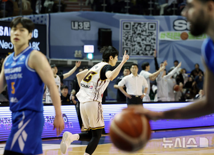 [서울=뉴시스] 조성우 기자 = 2일 오후 서울 송파구 잠실실내체육관에서 열린 2025~2026 LG전자 프로농구 정규리그 서울 삼성 썬더스와 창원 LG 세이커스의 경기, LG 정인덕이 3점슛을 넣고 기뻐하고 있다. 2026.01.02. [email protected]