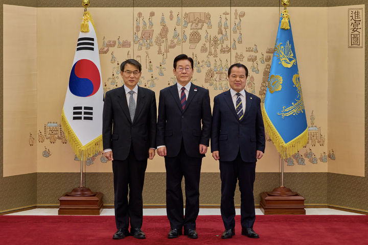 [서울=뉴시스] 이재명 대통령이 2일 청와대 본관 접견실에서 위철환 중앙선거관리위원에게 임명장을 수여한 뒤 기념촬영을 하고 있다. 왼쪽은 노태악 중앙선거관리위원장. (사진=청와대 제공) 2026.01.02. [email protected] *재판매 및 DB 금지