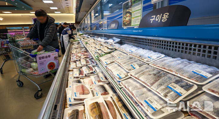 [서울=뉴시스] 정병혁 기자 = 4일 서울 서초구 하나로마트 양재점을 찾은 시민들이 고등어, 갈치 등 수산물을 살펴보고 있다.