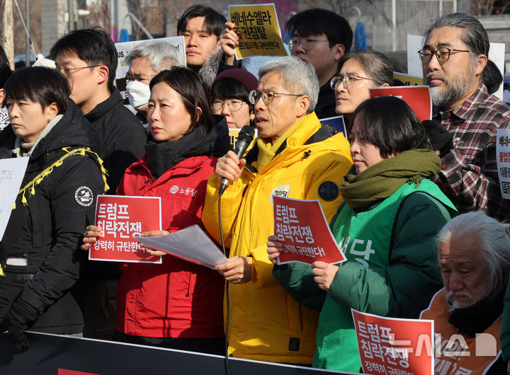 [서울=뉴시스] 배훈식 기자 = 권영국 정의당 대표가 4일 오후 서울 종로구 주한 미국대사관 앞에서 열린 미국의 베네수엘라 침공 규탄 긴급 기자회견에서 발언하고 있다. 2026.01.04. [email protected]