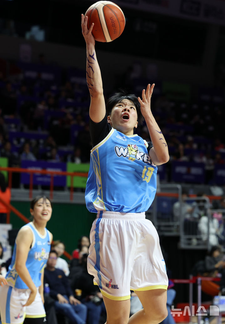 [부산=뉴시스] 이영환 기자 = 4일 오후 부산 동래구 사직실내체육관에서 열린 2025-2026 여자프로농구 올스타 페스티벌 팀 유니블과 팀 포니블의 경기 1쿼터, 팀 포니블 진안이 슛을 하고 있다. 2026.01.04. [email protected]